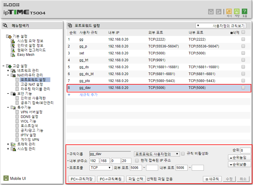 공유기 포트포워드 설정에서 새규칙을 추가한다.