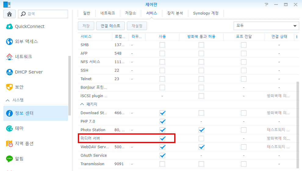 제어판 - 정보 센터 - 미디어서버 - 서비스 에서
