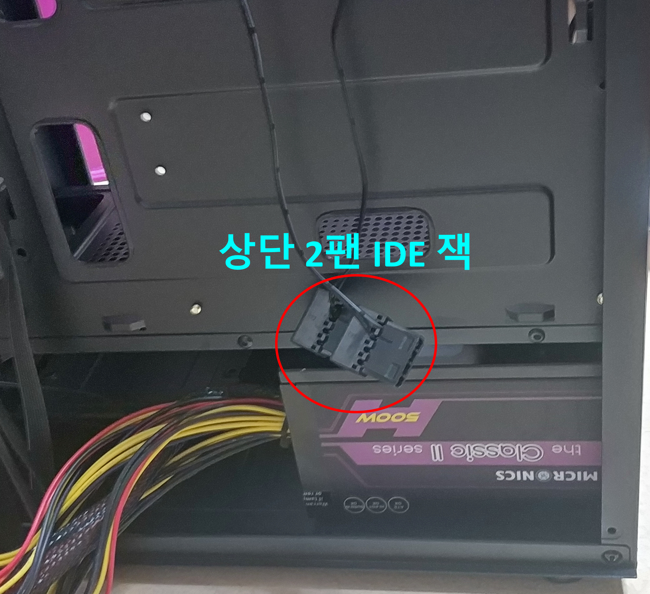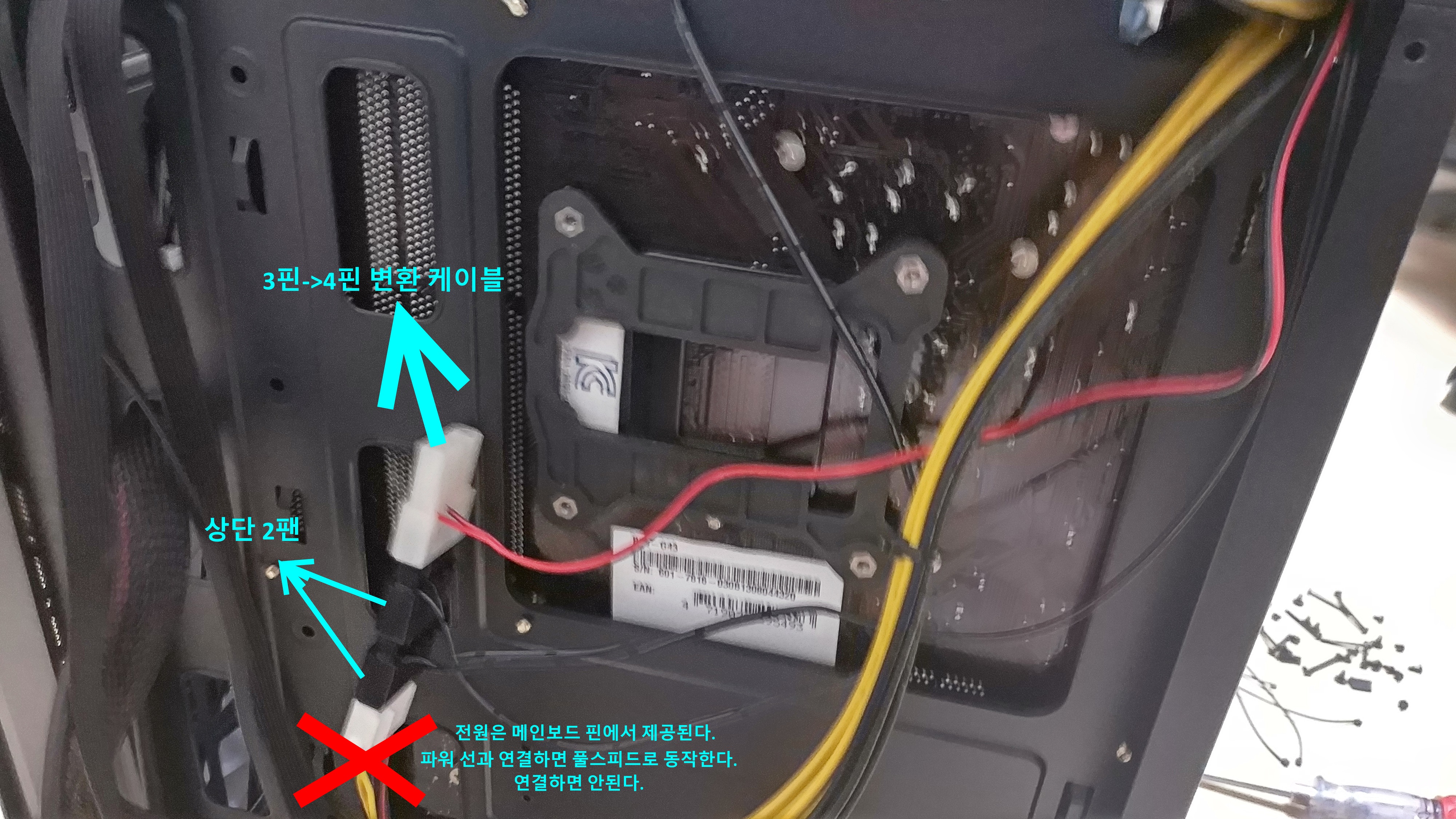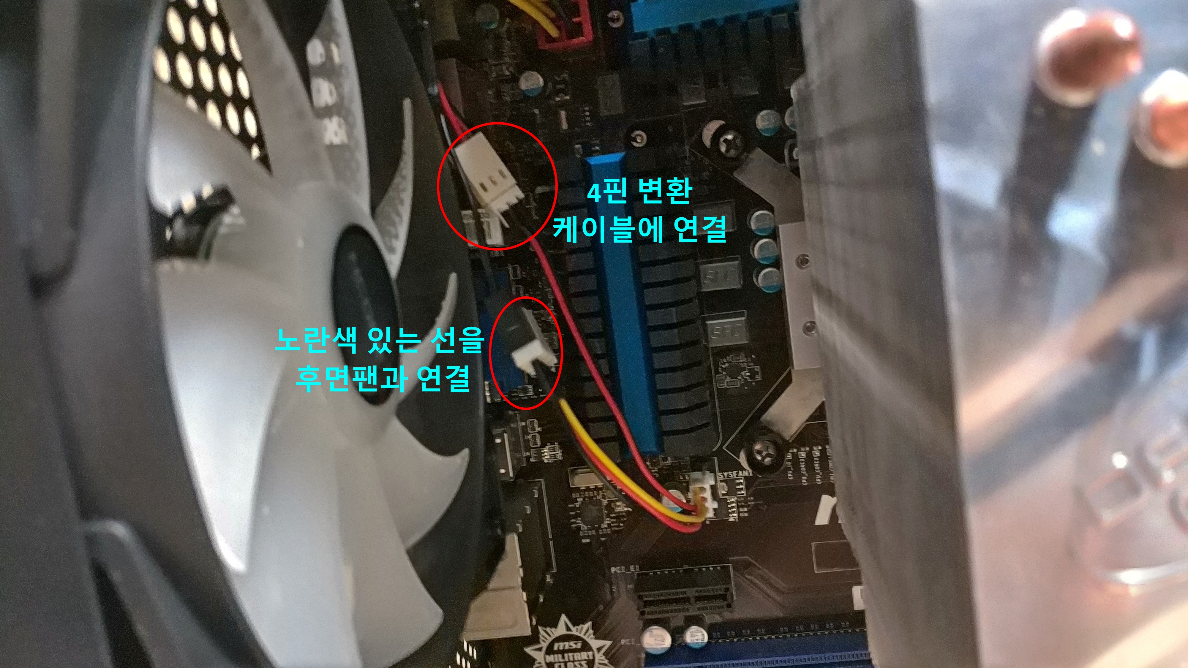 2) 3핀 Y케이블 노란색 있는 잭을 후면 팬과 연결한다.