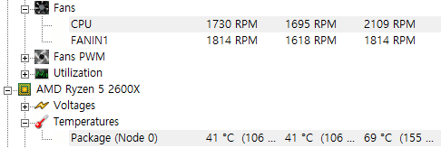 Wratih Max 쿨러의 HWMonitor 프로그램 측정치를 보면