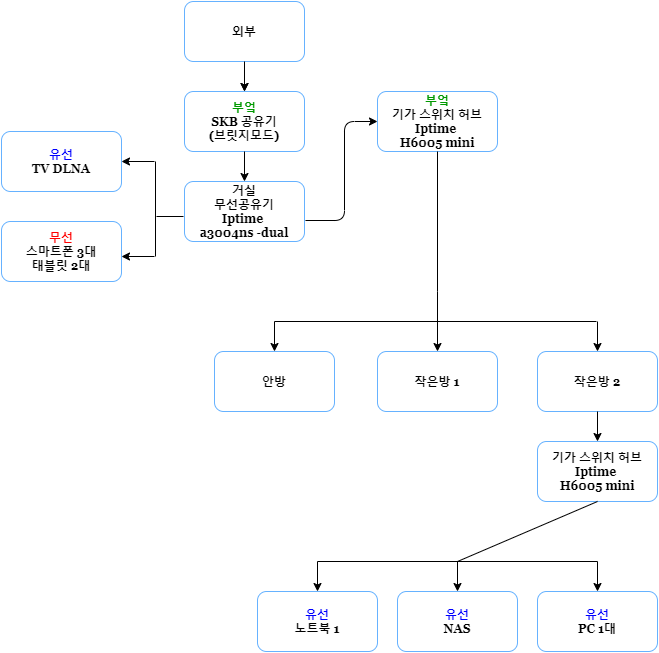 단자함 -> SKB모뎀에서 거실 1포트만 연결(거실 2포트와 나머지 방은 연결하면 안됨.) -> 거실 무선공유기 WAN 포트에 1포트 연결 -> 무선공유기 일반포트에서 거실 2포트 연결 -> 단자함 의 2포트를 기가스위치허브 포트에 연결 -> 기가스위치 허브 나머지 포트에 각방 포트 연결.