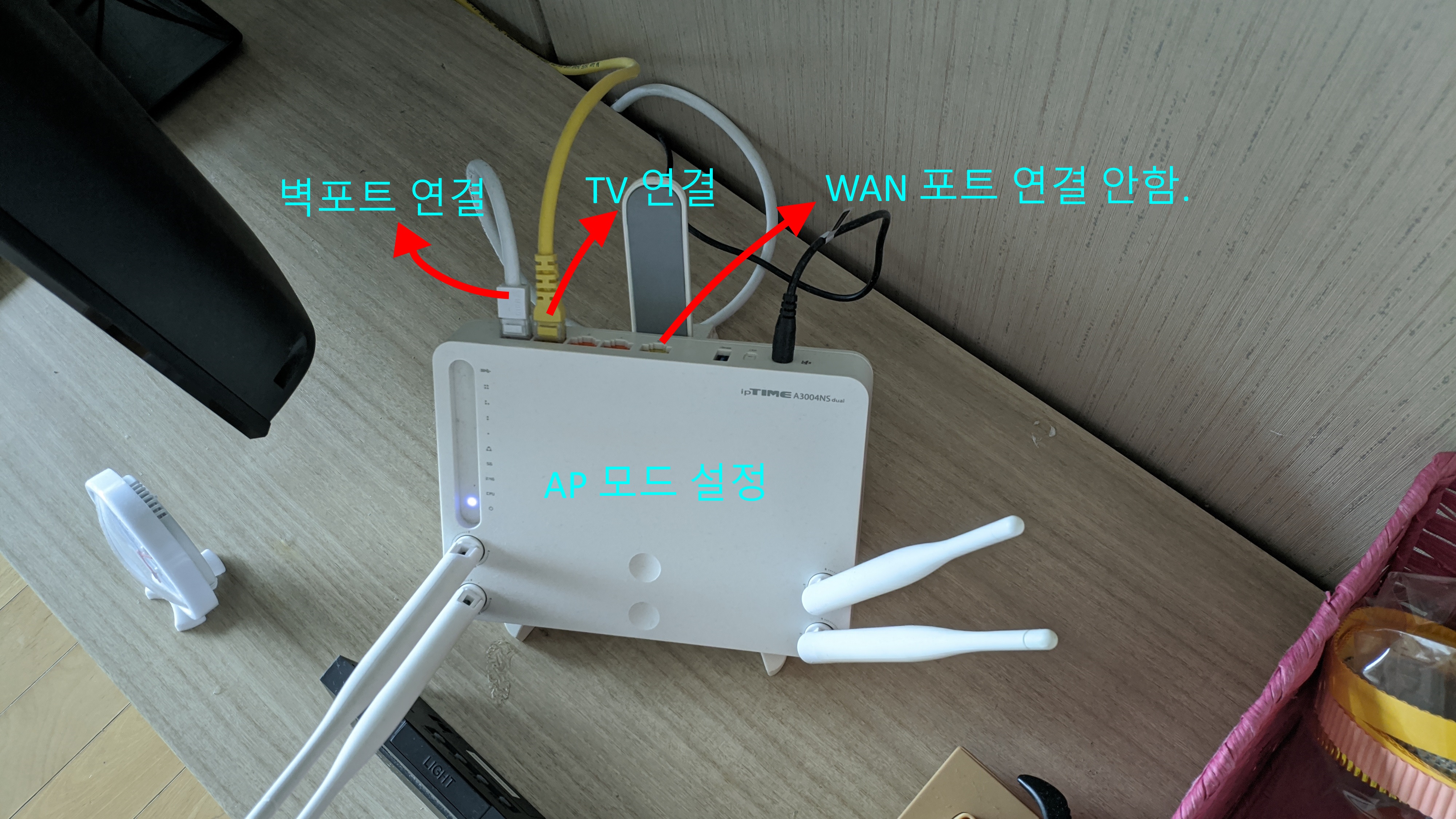 2) 거실 무선공유기(a3004ns-dual)의 일반 포트에 벽포트를 연결. (WAN 포트를 연결하면 안된다.)